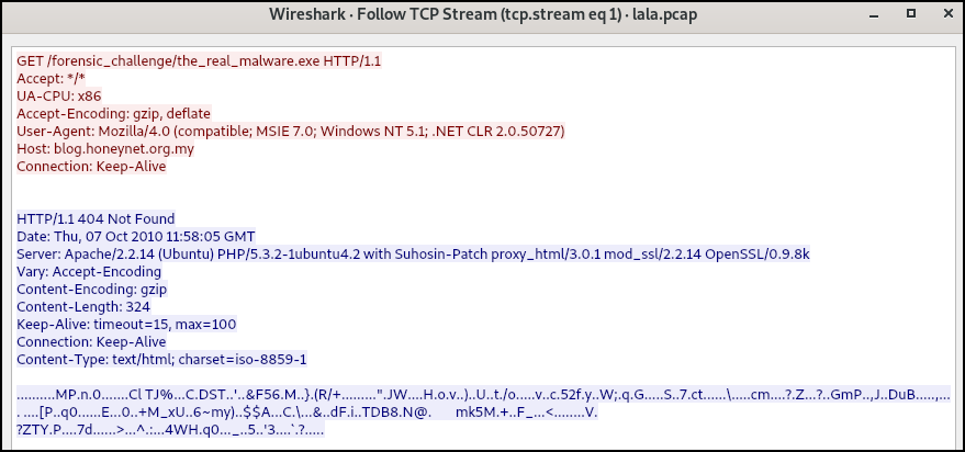 The fcexploit.pdf appears to act as a downloader because after it’s downloaded, it sends a GET request to downloads the_real_malware.exe from http://blog.honeynet.org.my/forensic_challenge/.